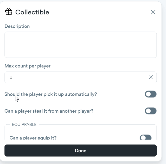 * **Can a player equip it?** This let’s players equip the collectible on their character, like a wearable