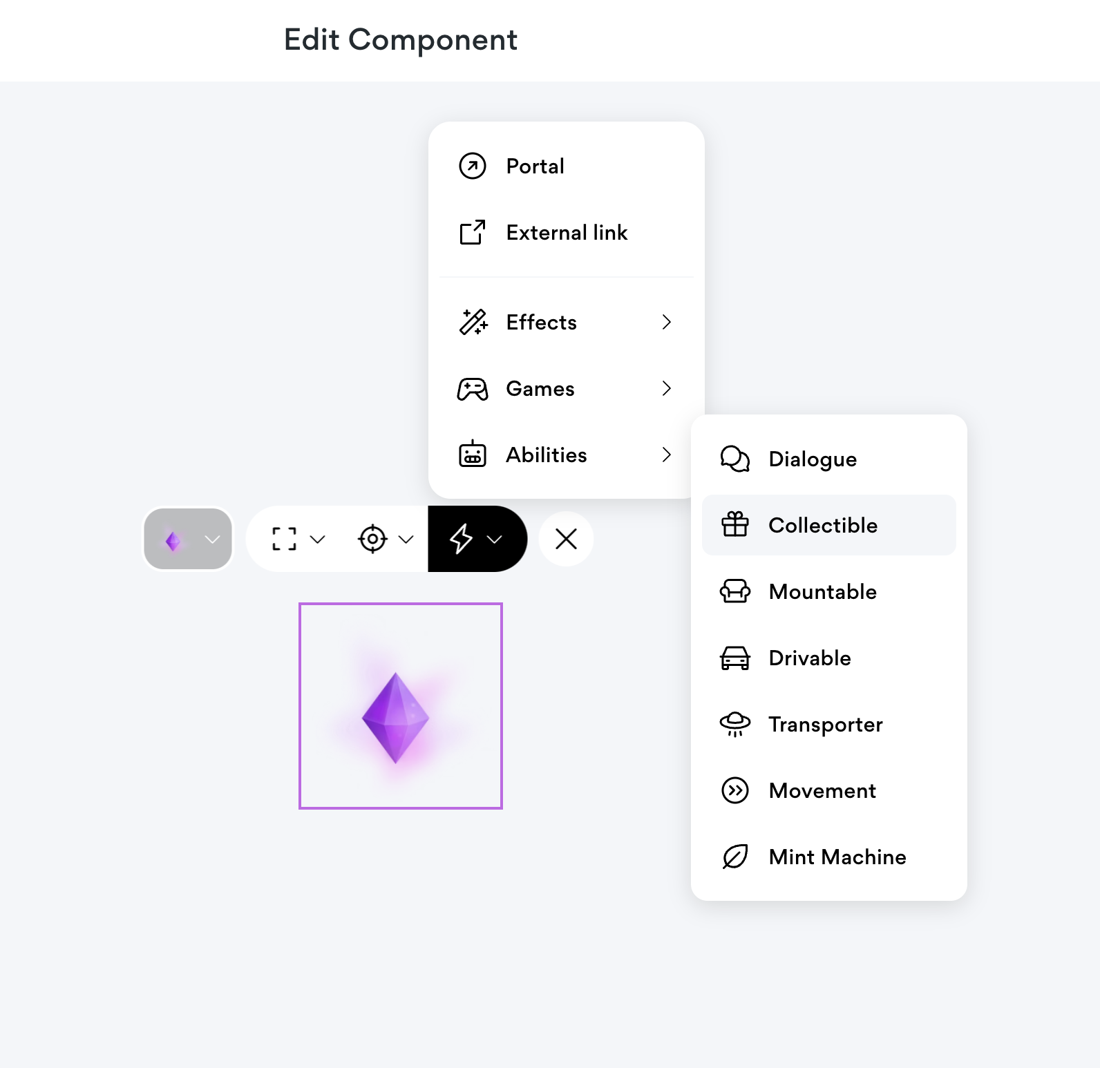 <figure><img src="https://107867006-files.gitbook.io/~/files/v0/b/gitbook-x-prod.appspot.com/o/spaces%2FdnMYfhsZ5GJTgbm1KIe7%2Fuploads%2Fx4KEsEKTdFcPX4lUt19e%2Fedit.png?alt=media&#x26;token=fc655527-c6cd-4335-be9f-c7f4b197b34a" alt=""><figcaption><p>Edit the component to make it a collectible item</p></figcaption></figure>