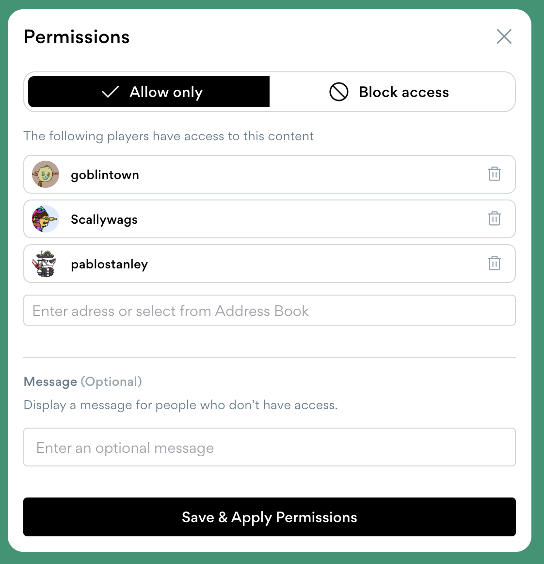 You can select entire NFTs or individual players to token-gate. For example, in the following settings, this will allow anyone with a goblintown NFT, a Scallywags NFT, or Pablo Stanley to enter the portal: