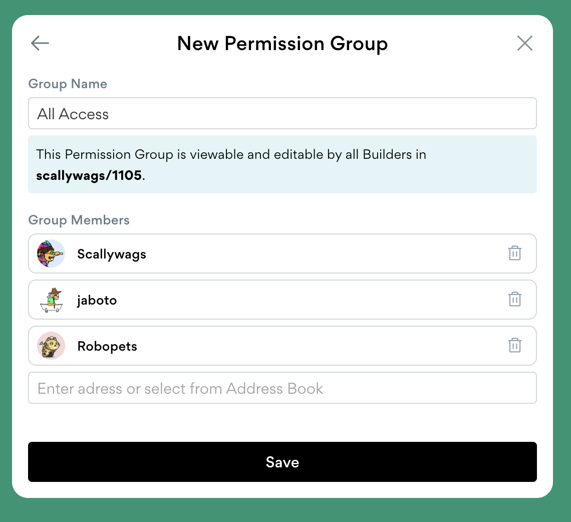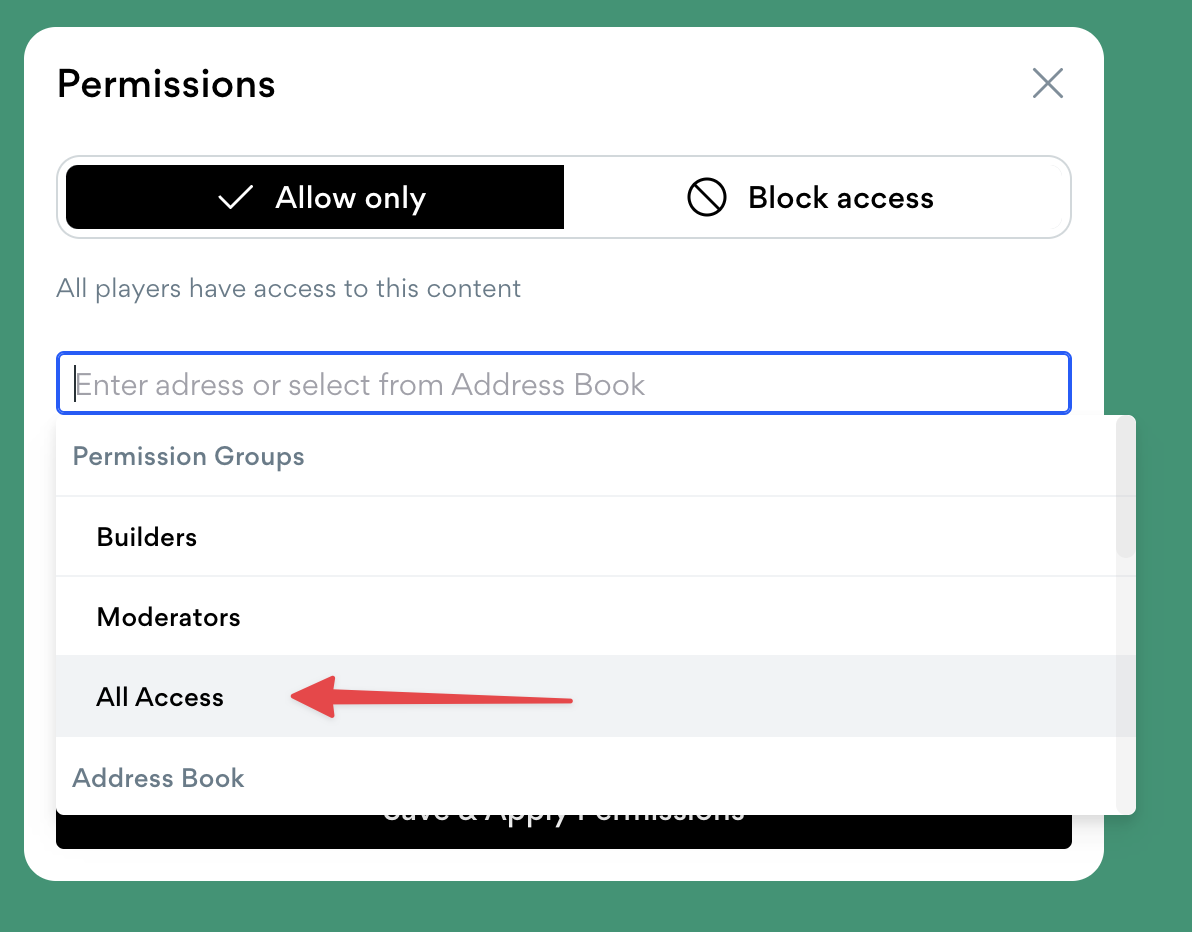 If you create a Permission Group, you have a single place to edit who has access to certain permissions. That way, if you want to give a player or an NFT contract access to a whole bunch of different things, you can do it in just one spot.
